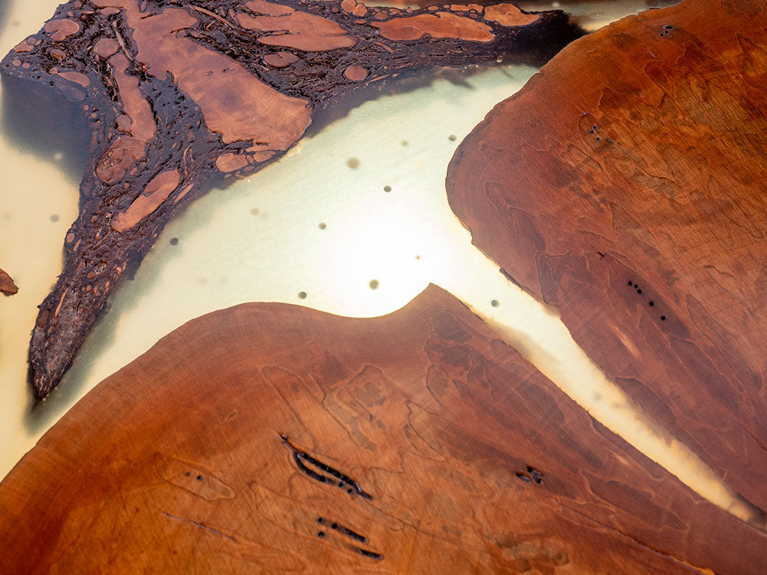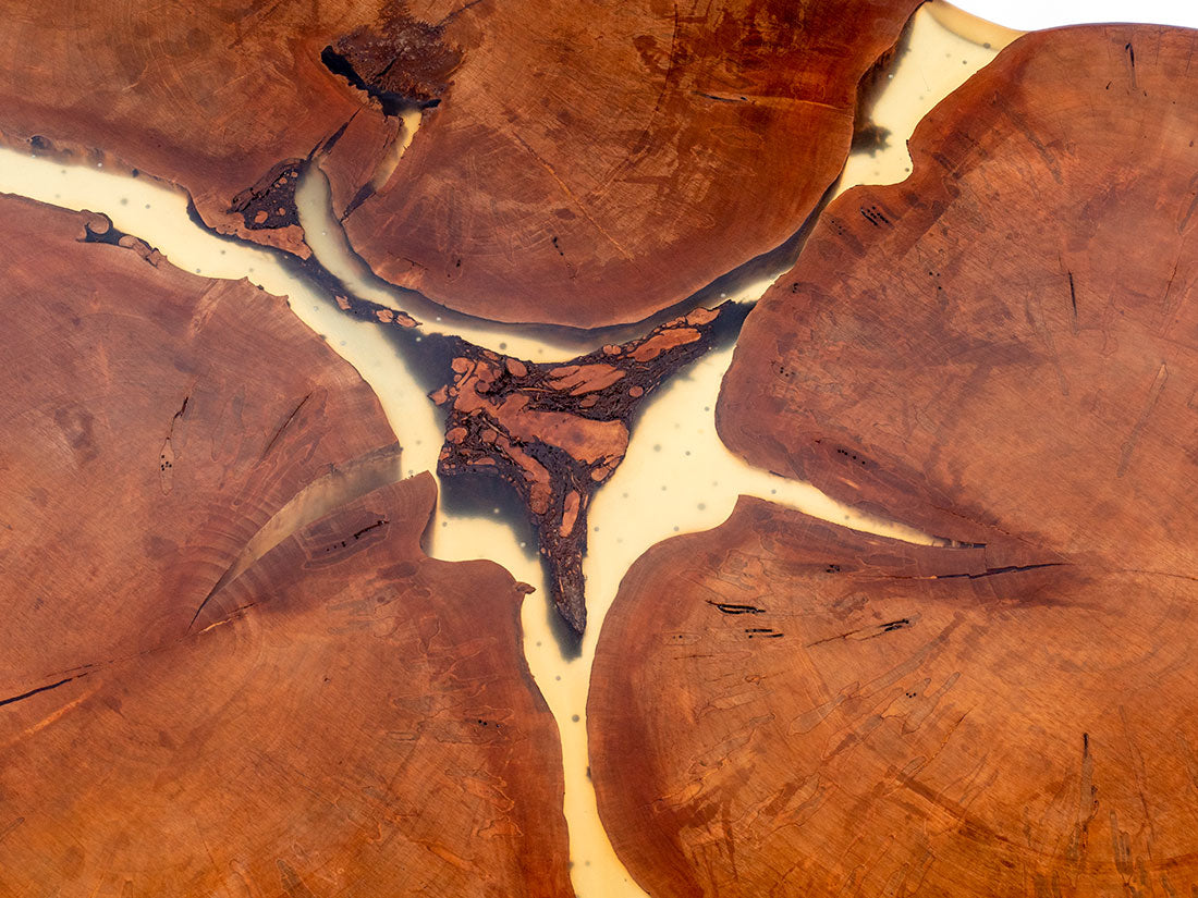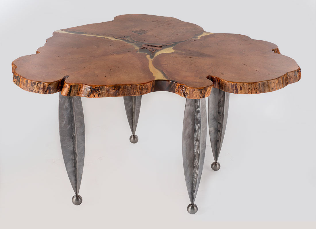 Made from three hearts of a Red Ambrosia Maple tree, this table is joined using an epoxy resin with recycled metal slugs submerged throughout. It is finished with a honey Italian dye and a multi-layer lacquer coating.