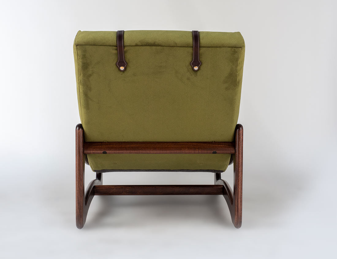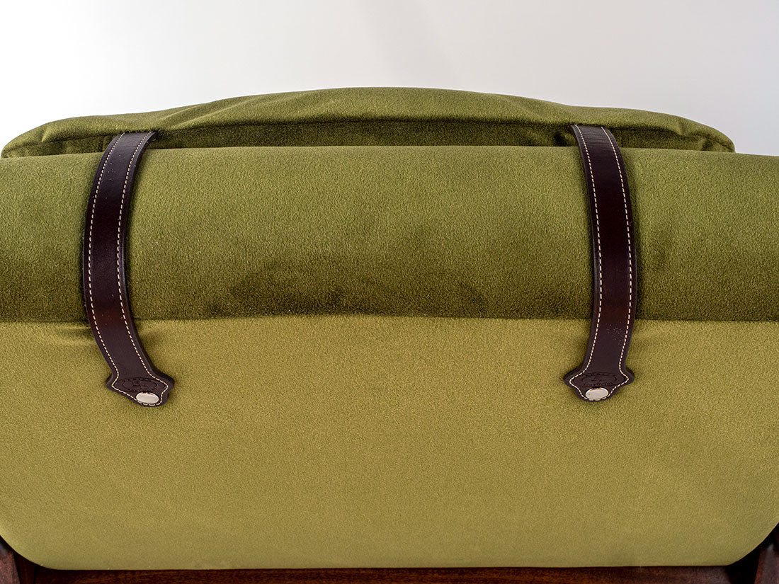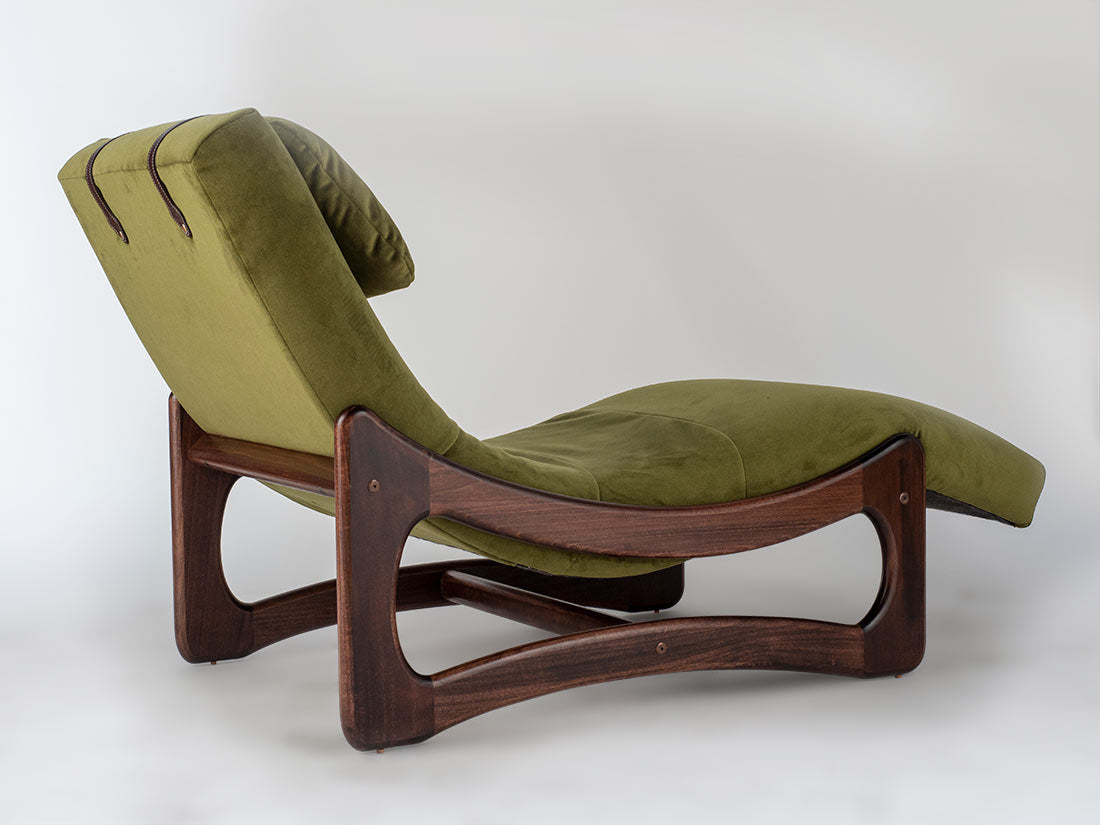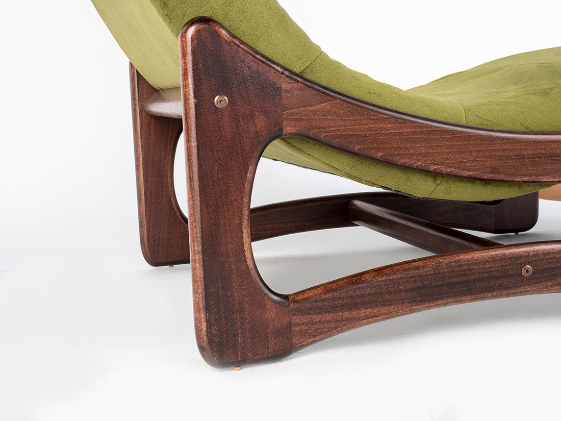 Featuring molded plywood with multi-layer, fire retardant, urethane foam, our 1924 Chaise Lounge in Geordie Evergreen fabric is braced by our uniquely designed side arms, made from solid American hardwood. The arms of this chaise lounge are fabricated with a double dowel construction and finished with a hand-rubbed Walnut stain and multi-layer coated lacquer.
