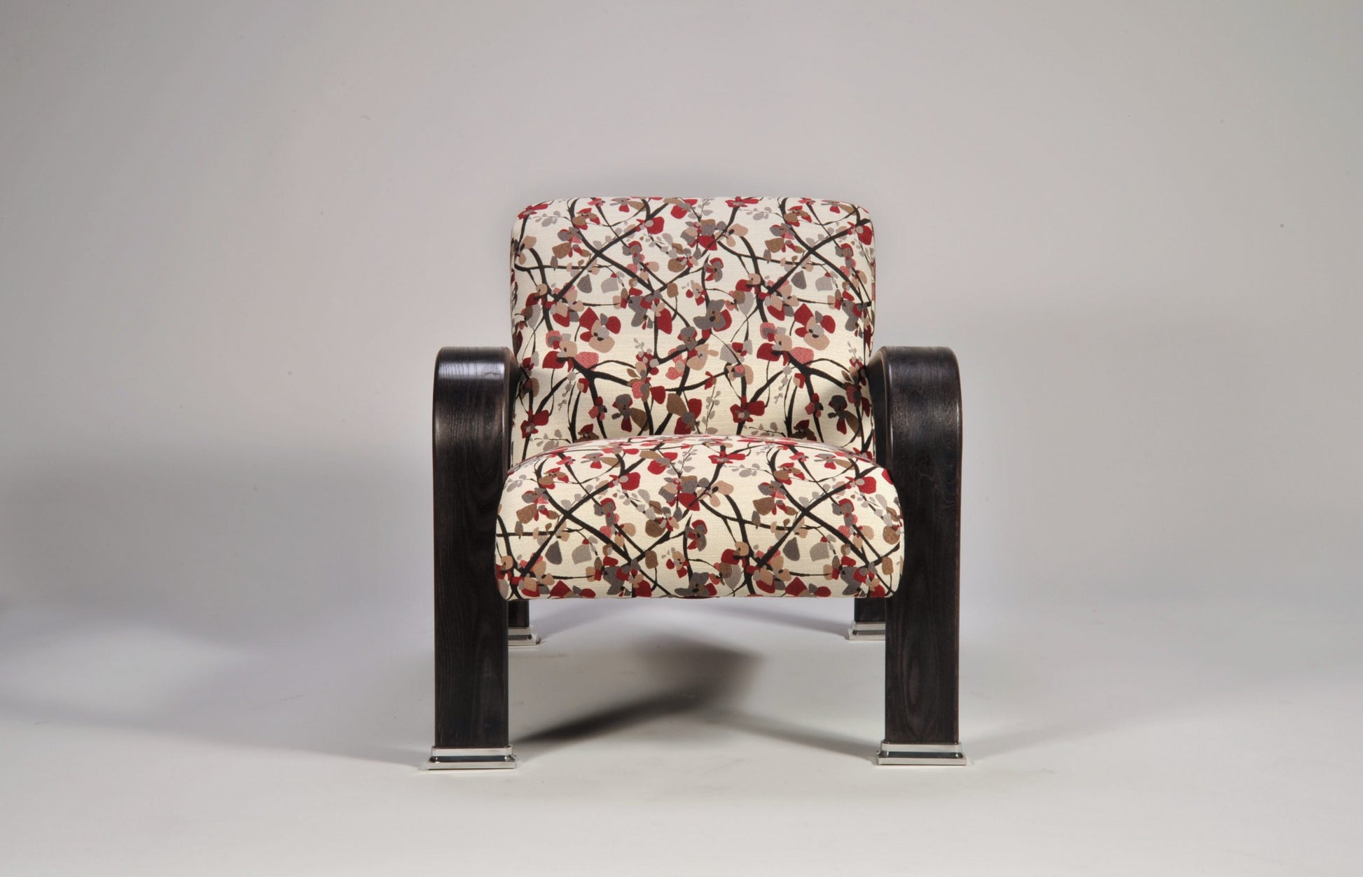This 1905 Lounge Chair and 1910 Ottoman set is comprised of steam bent arms made from flamed Ash, polished aluminum machined feet, solid maple double doweled seat & back frame with Sinuous springs suspension and multi-layer, fire retardant, urethane foam. The exposed wood arms are Solid Flamed American Ash and finished with black Italian dye and a hand rubbed, multi-layer coated lacquer. The featured upholstery for this contemporary 1905 Lounge Chair and 1910 Ottoman is a durable polyester/rayon blend with a bright, eye-catching floral pattern that compliments the steam bent, solid Ash arms. The polished aluminum feet add a distinct finish to the look.