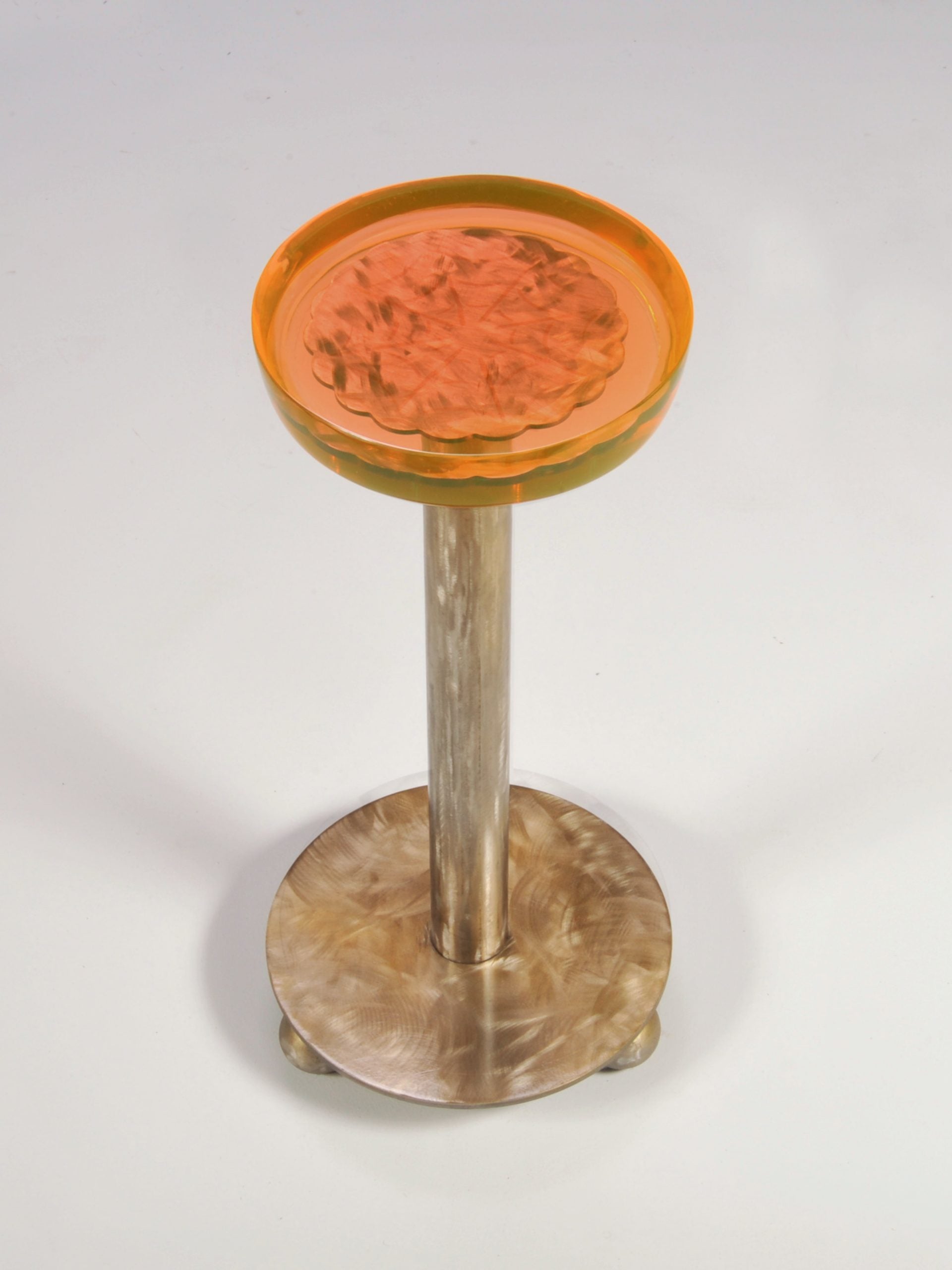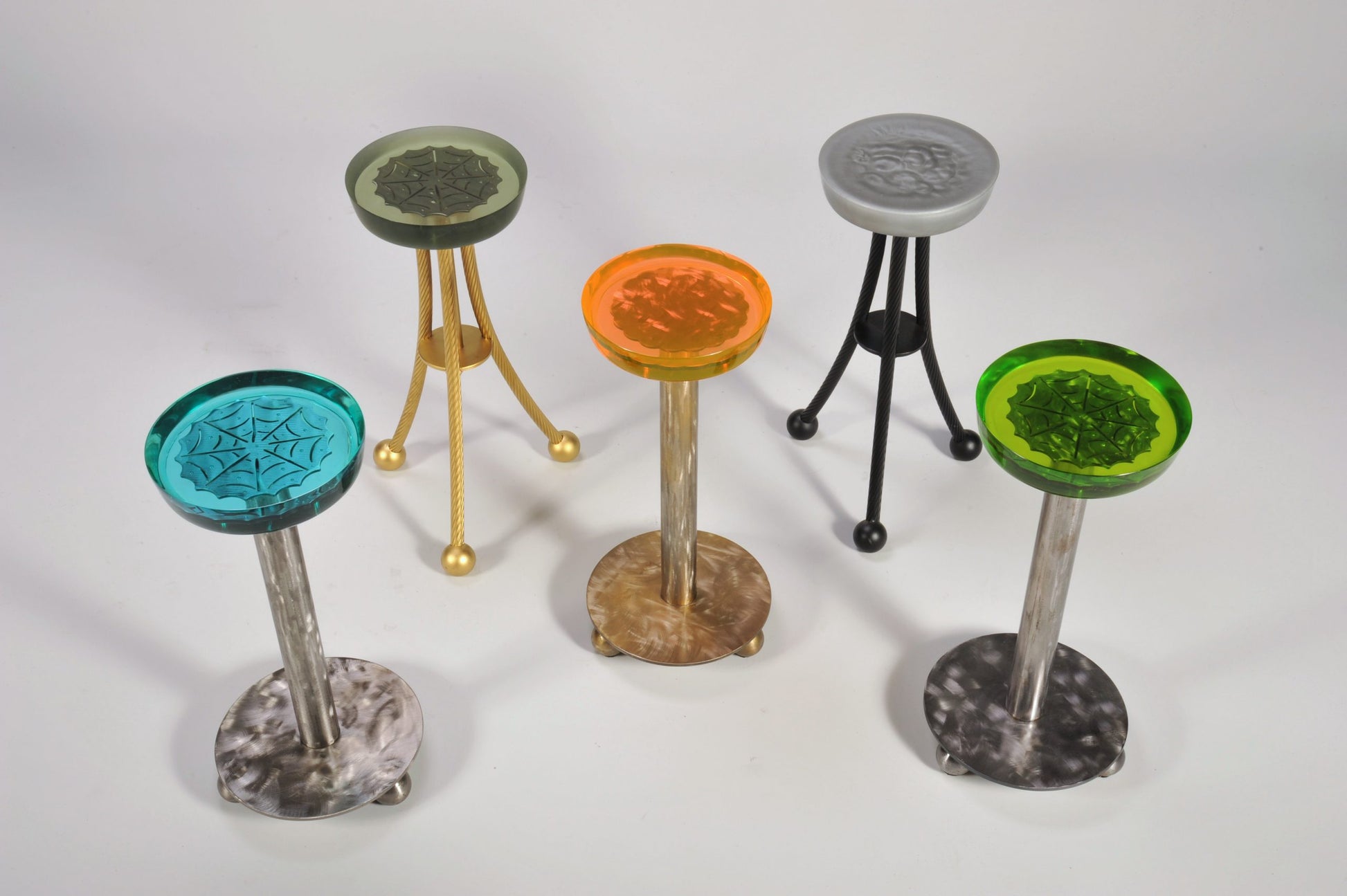 These exquisite Enrico Bartolini Martini Tables are original works of art, crafted from a variety of colored epoxies, and they feature various metal inserts submerged within the epoxy, enhancing the table's aesthetic appeal.