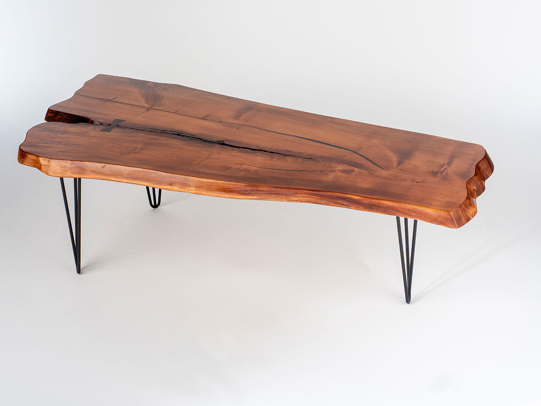 Enhance your interior with this stunning Spalted Maple live edge slab, an epitome of natural beauty. The Spalted Maple Center Table w/ Hairpin Legs is adorned with captivating details, including black epoxy accents and a meticulously hand-set walnut bowtie. It's thoughtfully finished with a honey Italian dye and a protective multi-layer lacquer coating, ensuring both its aesthetic appeal and durability.