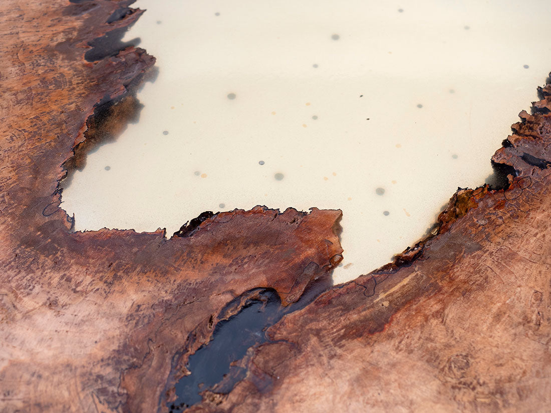 Elevate your space with this exceptional Spalted Norway Maple live edge crosscut table, a true work of art. The centerpiece of the Spalted Norway Maple Crosscut Table – Brass Tag 102 is a transparent epoxy pool in the center, adorned with submerged metal slugs. When light dances through it, it creates a truly unique and mesmerizing visual effect.