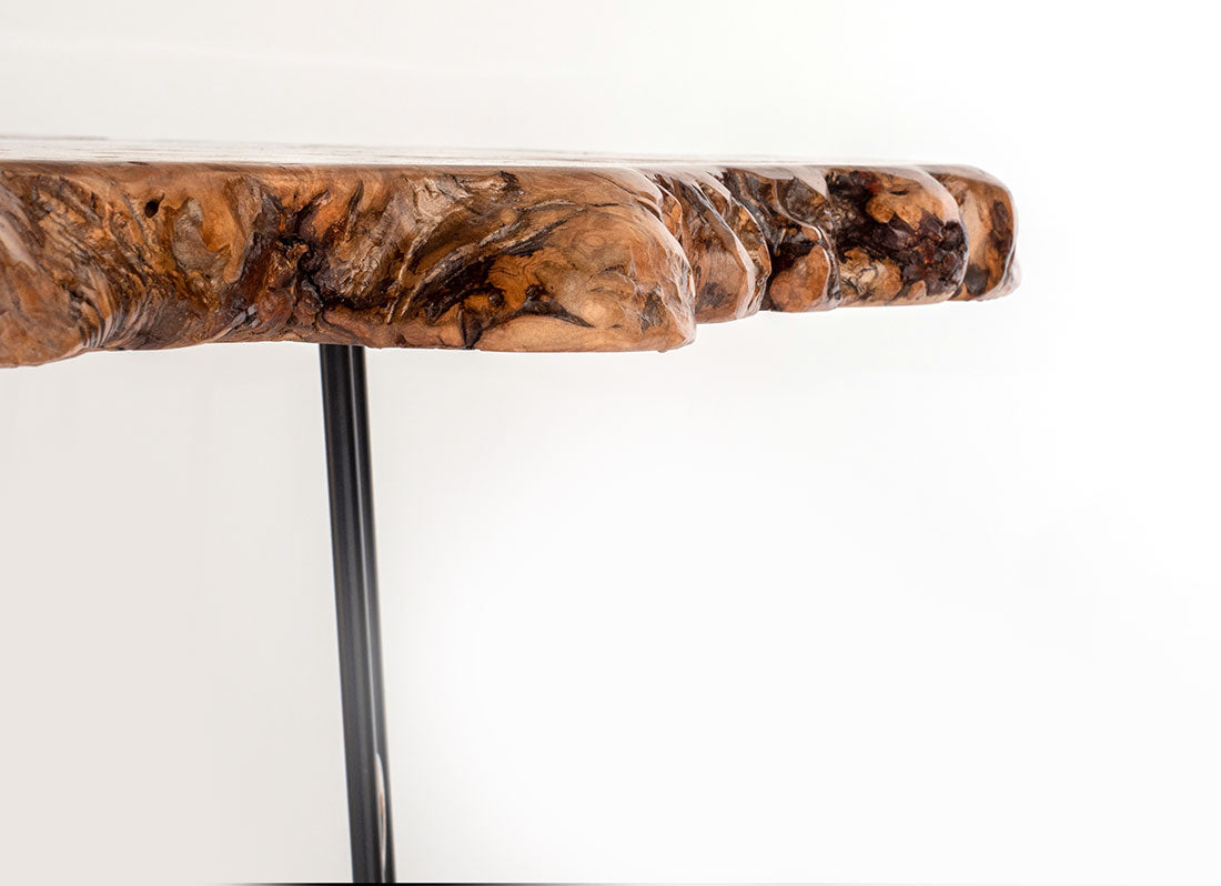 Finished with a honey Italian dye and a protective multi-layer lacquer coating, the Spalted Norway Maple Crosscut Table – Brass Tag 102 is both a statement of beauty and a testament to craftsmanship. It stands elegantly on four 3/8" hairpin legs, which are finished in a sleek black, high solids paint. Each leg features the distinctive EB stainless steel logo.