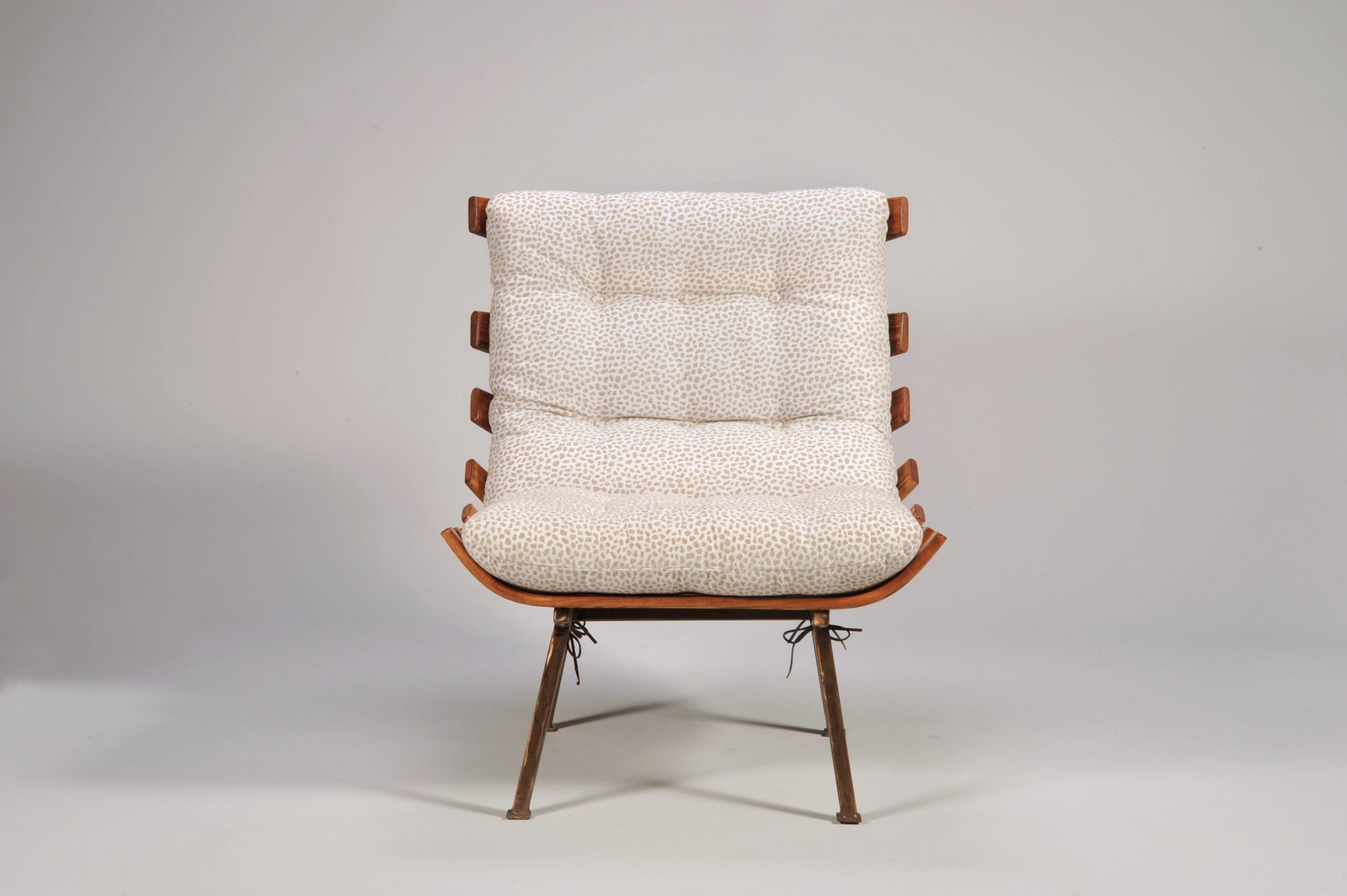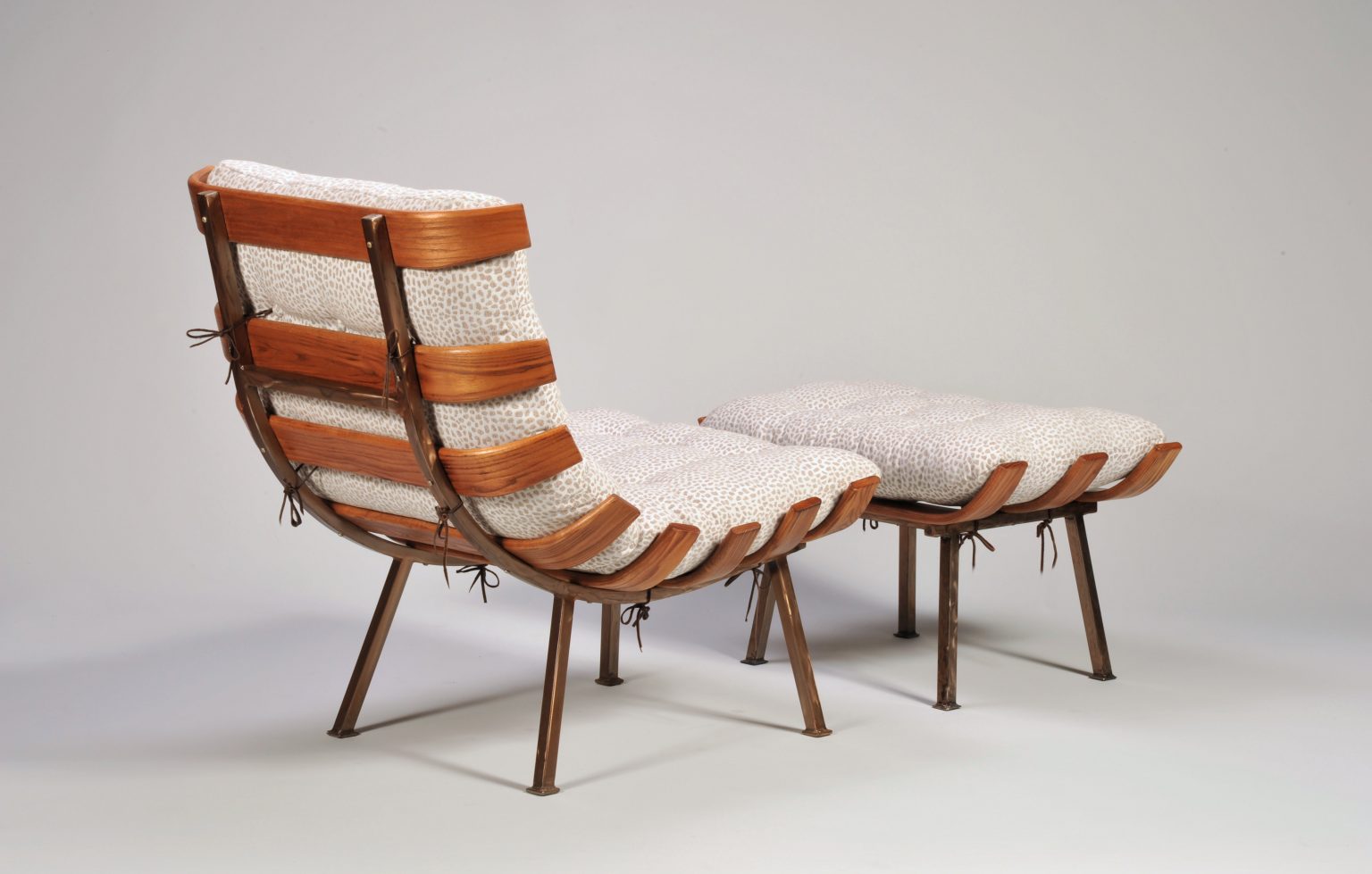 Featuring our Model 1906 Spine Chair and Ottoman group. This rendition of a 1950's classic is built with steam bent, solid Ash support slats (ribs) and supported by heavy gauge, hand ground steel tubing with a honey Italian dye and multi-layer lacquer finish. Its seat, back and ottoman cushions are button tufted and fastened to the frame with Bridle leather ties. This beautiful chair and ottoman group dawns a comfortable yet functional 100% Polyester fabric in Hopper Natural.